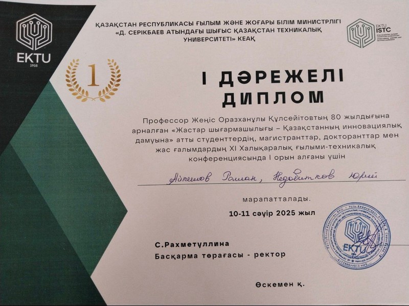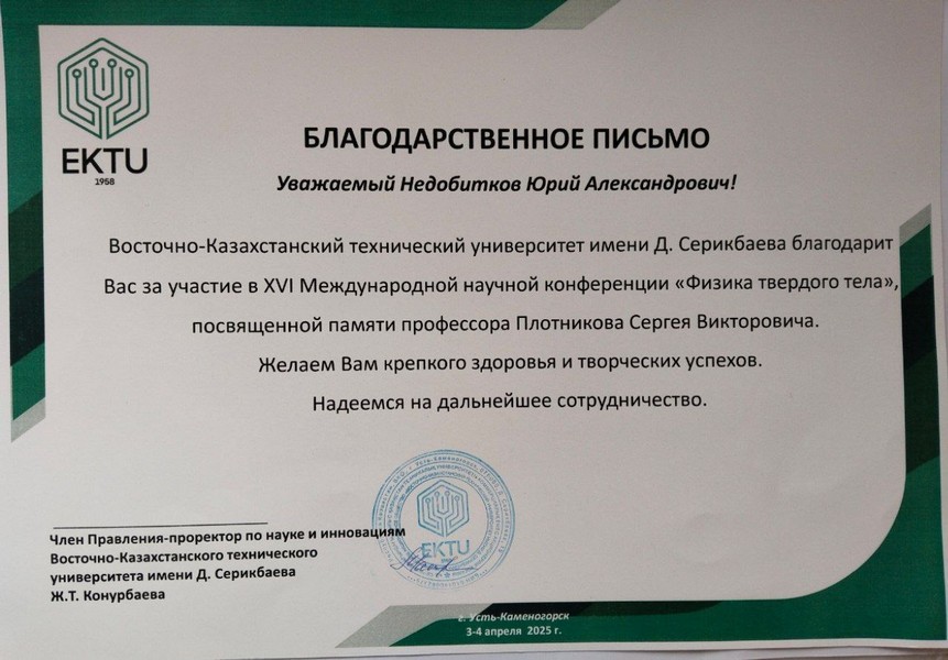2. Макаренко А.Е., Кульбакин И.С., Перевалов Т.Д., Кузнецова А.К., Квеглис Л.И., Лесков М.Б., Ерболатова Г.У. Свойства сверхпластичных никельсодержащих сплавов // XVI Международной научной конференции, посвященной памяти профессора Плотникова Сергея Викторовича», Усть-Каменогорк, 2025, С.82-86