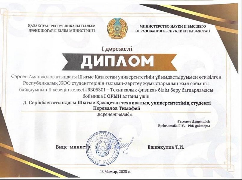 «Жас физиктер » үйірмесінің жұмысына белсенді қатысуының арқасында Перевалов Т.Д. ғылыми жобаны сәтті жүзеге асырып , СҒЗЖ байқауында I орын алды . Бұл жетістік студенттердің зерттеу дағдыларын қалыптастырудағы үйірменің маңызды рөлін көрсетеді .