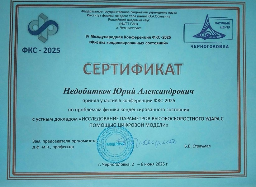 11. Недобитков Ю.А. Результат ударно-волнового воздействия в медной фольге // XIII Всероссийская конференция с международным участием «Химия твёрдого тела и функциональные материалы 2024», с. 476.