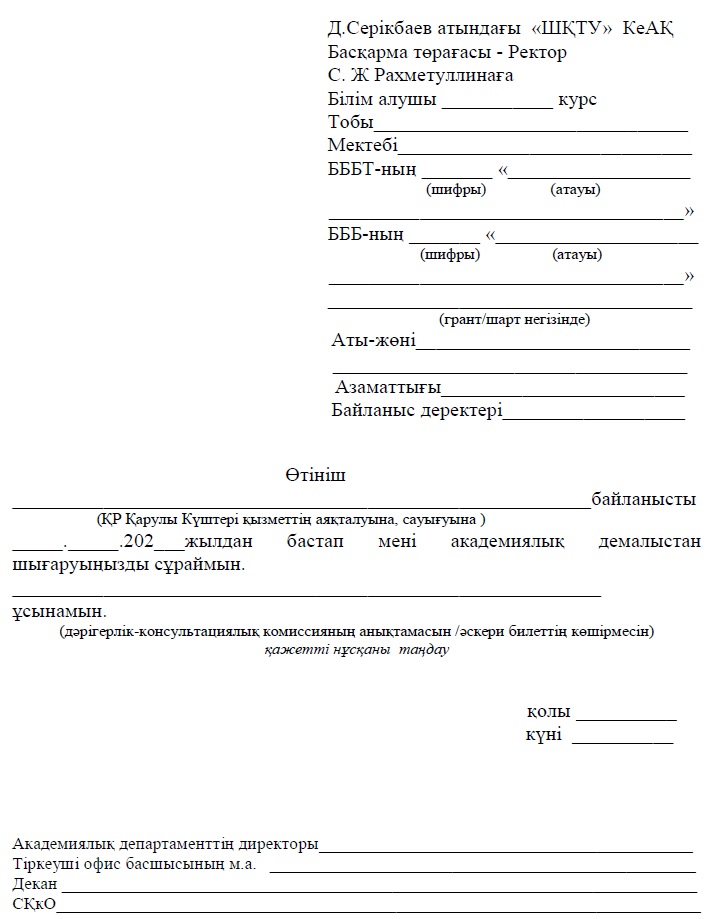 Мені _______________________________________________________________________________ ҚР ӘҚ қатарынан қайтаруына, ауруханадан шықаныма байланысты ______________________________________________________________________ академиялық демалыстан шыққан күні академиялық демалыстан шықты деп есептеүіңізді сұраймын. ______________________________________________________________________ ұсынамын әскери билеттің көшірмесін ұсынамын, ДКК қорытындысын