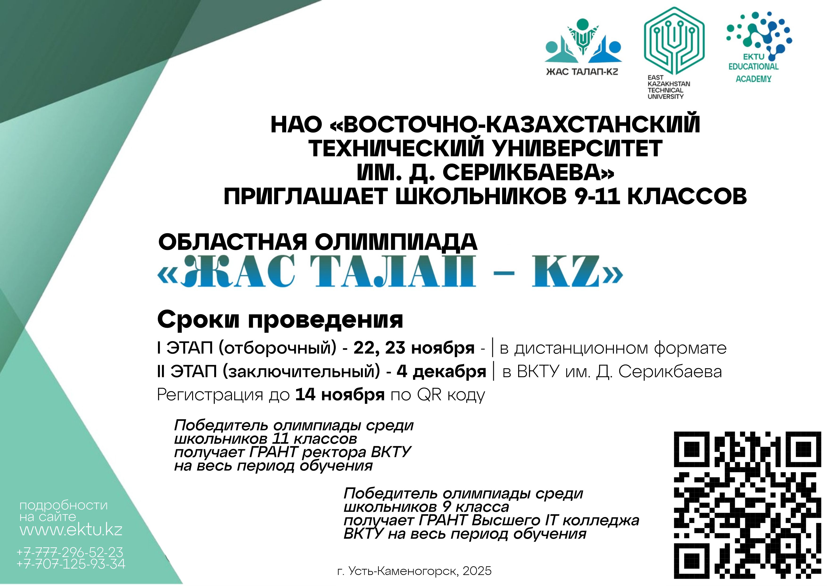 Победители олимпиады станут обладателями гранта ректора Восточно-Казахстанского государственного технического университета им. Д.Серикбаева!