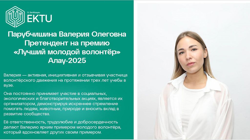 Председатель экологического клуба «Клевер» Парубчишина Валерия приняла участие в Конкурсе «Алау-2025» от ВКТУ им. Д. Серикбаева на соискание премии акима города Усть-Каменогорска в номинации «Лучший молодой волонтёр», присуждаемой молодым гражданам, внесшим вклад в реализацию государственной молодежной политики.