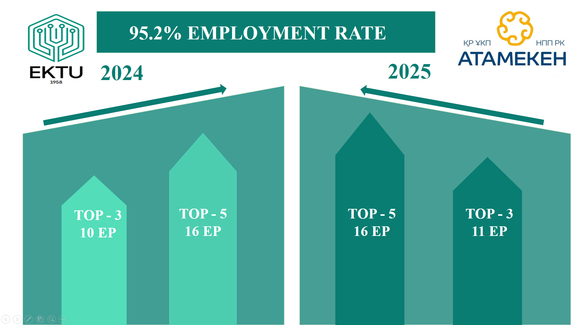 With a 95.2% graduate employment rate, EKTU ranked 2nd among state higher and postgraduate education organizations of the Republic of Kazakhstan. The ranking results from the National Chamber of Entrepreneurs of the Republic of Kazakhstan "Atameken" have once again confirmed the high quality of specialist training in high-demand fields, their high competitiveness, and the university's alignment with employer requirements and labor market demands.