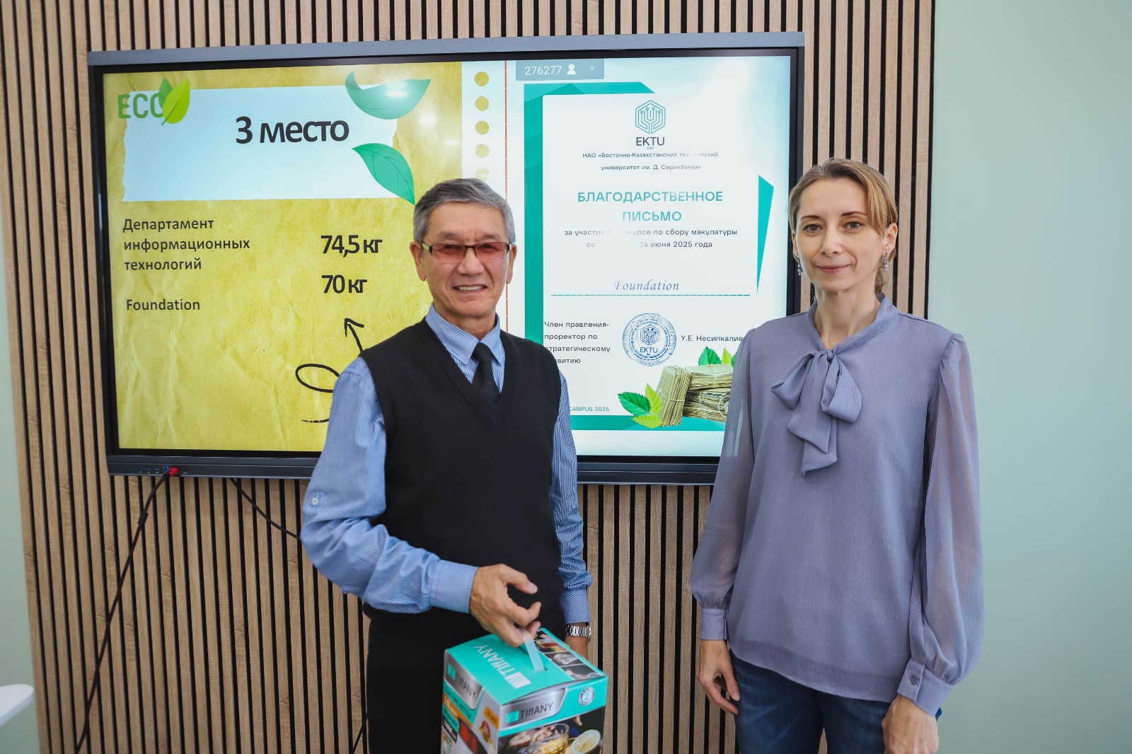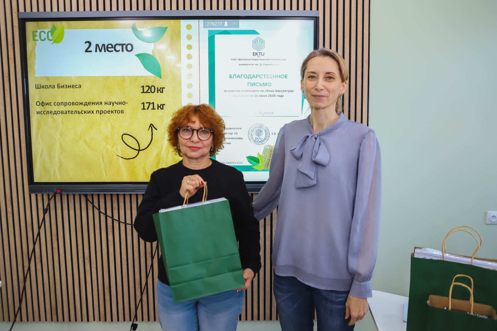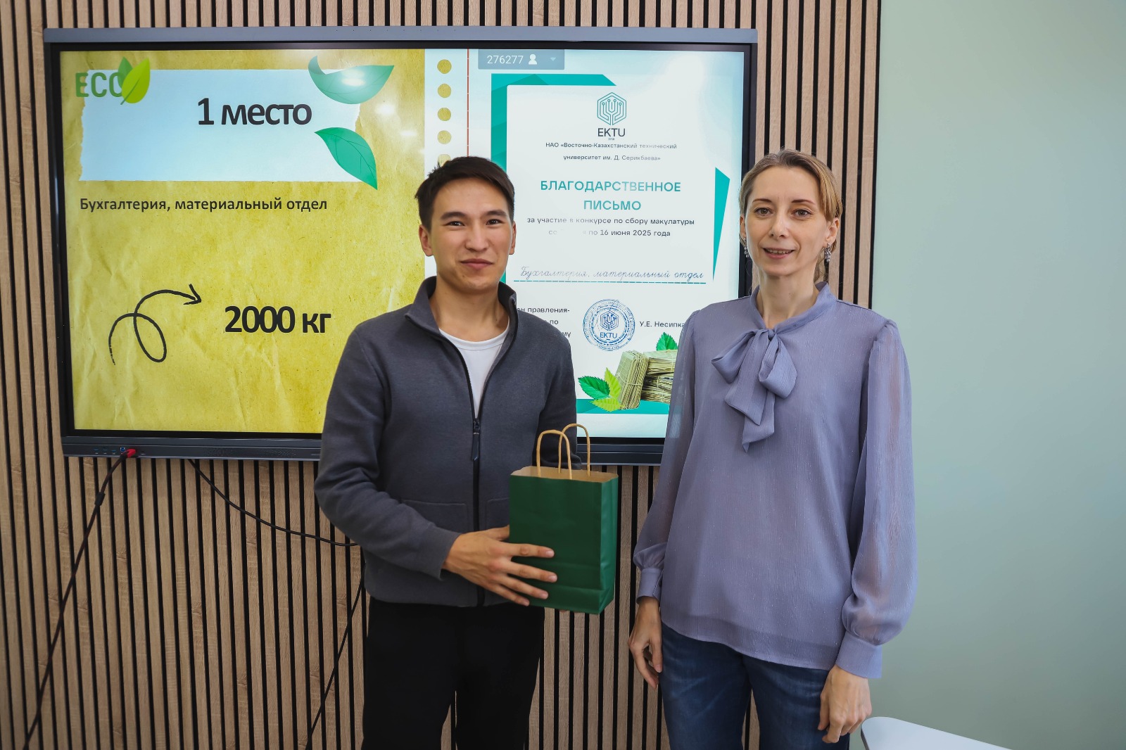 Д. Серікбаев атындағы Шығыс Қазақстан техникалық университетінде 2025 жылдың 2–16 маусымы аралығында өткен макулатура жинау байқауының қатысушылары марапатталды. Инициатива экологиялық мәдениетті дамытуға және университет қауымдастығын қоршаған ортаны қорғауға бағытталған нақты іс-шараларға тартуға бағытталды.