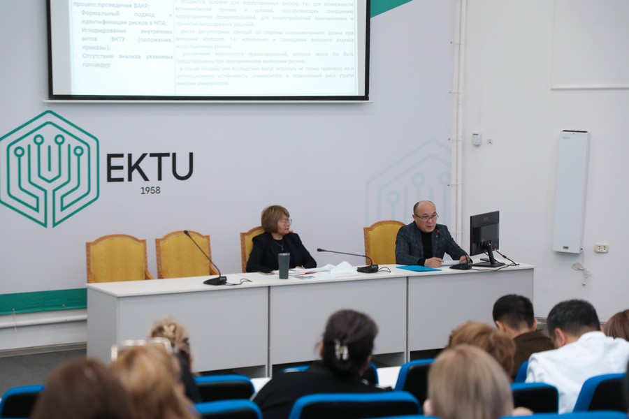 - Сыбайлас жемқорлық тәуекелдерін ішкі талдау (ВАКР) нәтижелері, анықталған бұзушылықтар, қателіктер мен кемшіліктер туралы мәселе. Баяндаманы университеттің комплаенс-офицері Қ. Мықтыбаев ұсынды.