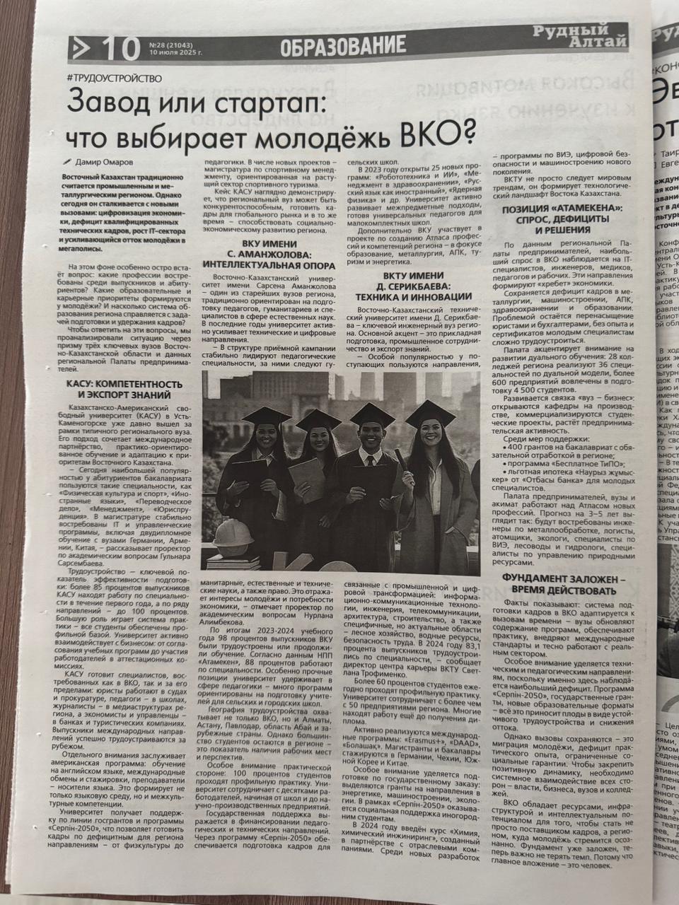 Уровень трудоустройства выпускников двух вузов Восточного Казахстана составляет 86%