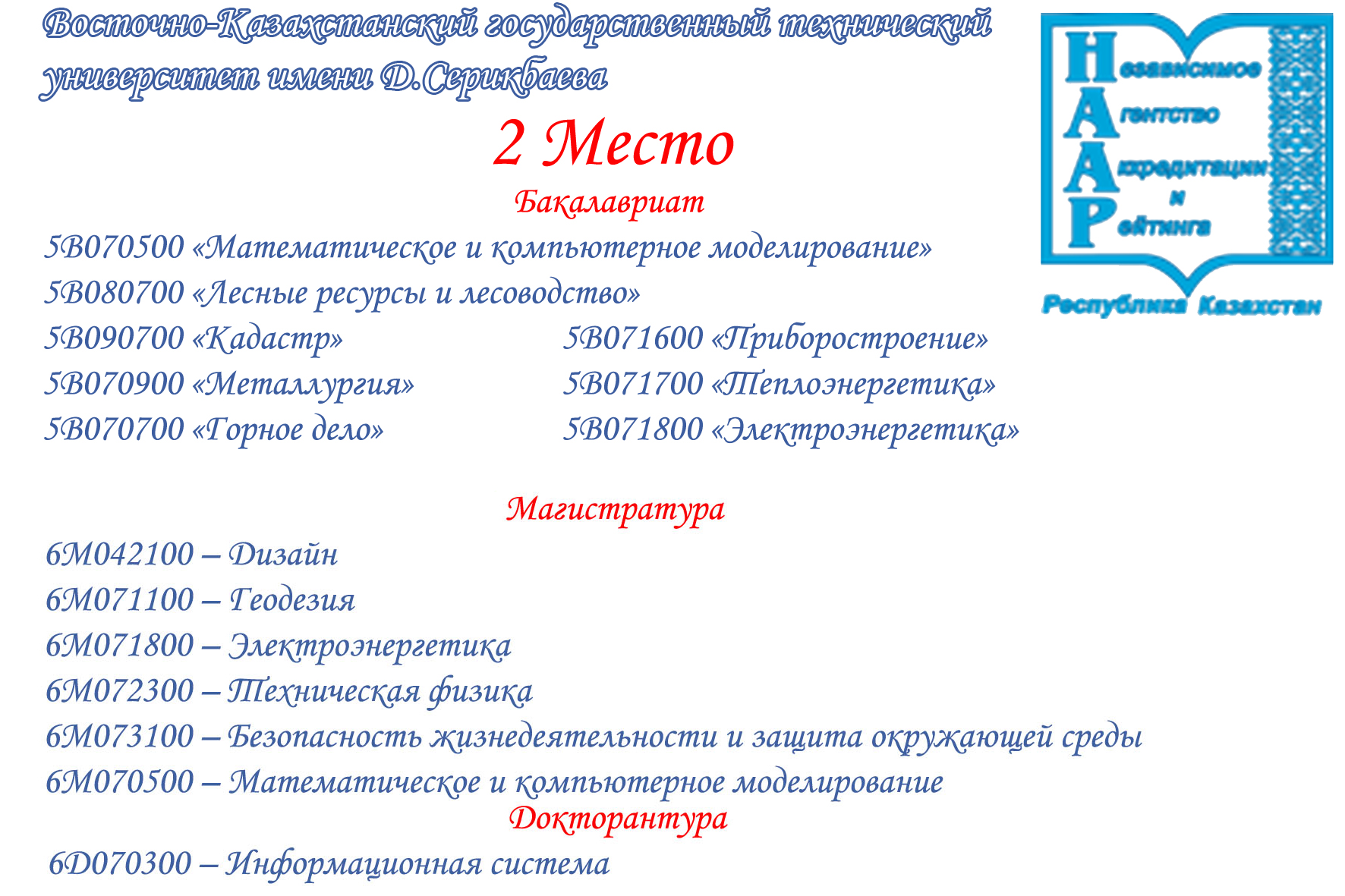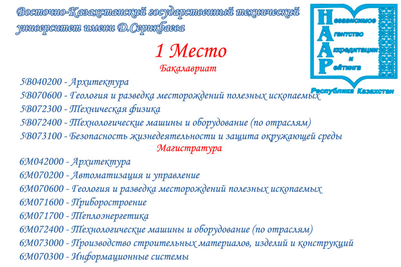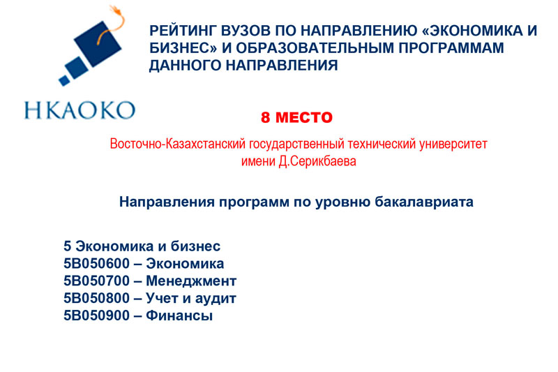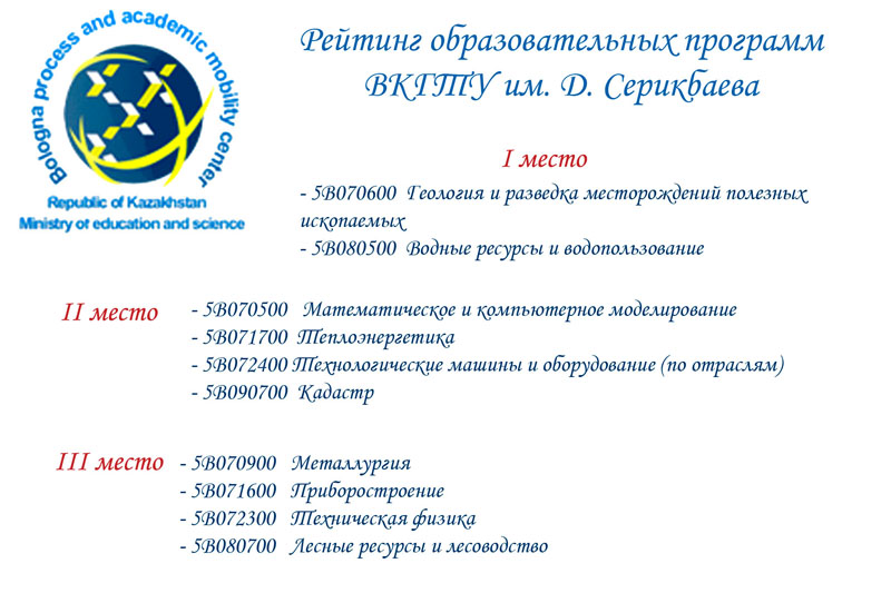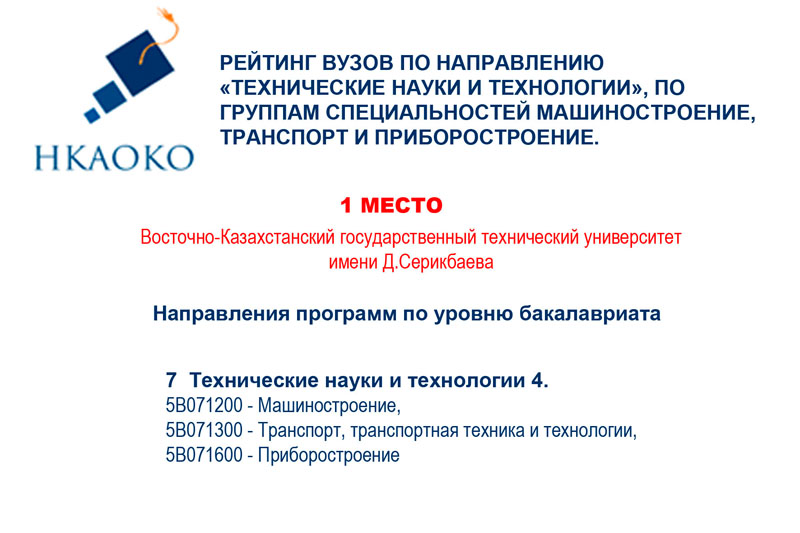 Биылғы жылы Д.Серікбаев атындағы Шығыс Қазақстан мемлекеттік техникалық университетінің көшбасшылар тобына бакалавриаттың он білім беру бағдарламасы бойынша кіруі, өңірдегі алдыңғы қатарлы университет болып, Қазақстанның 30 ең үздік ЖОО қатарына енгізілуі қуантады!