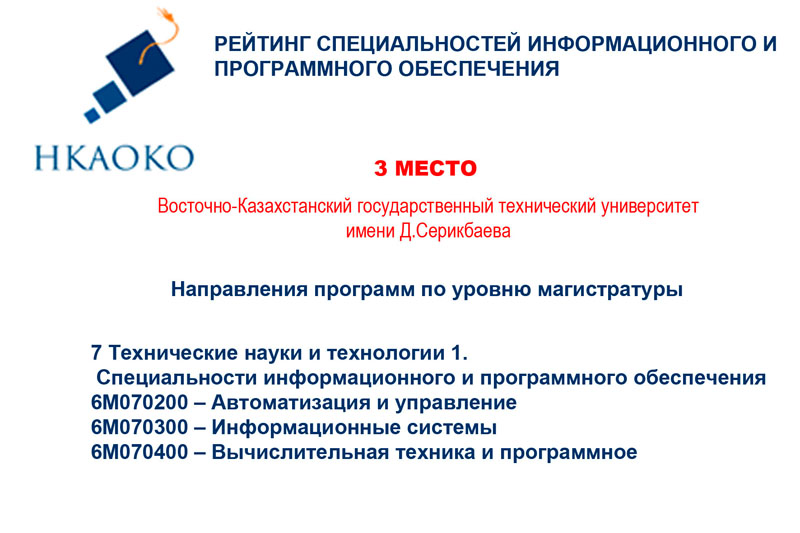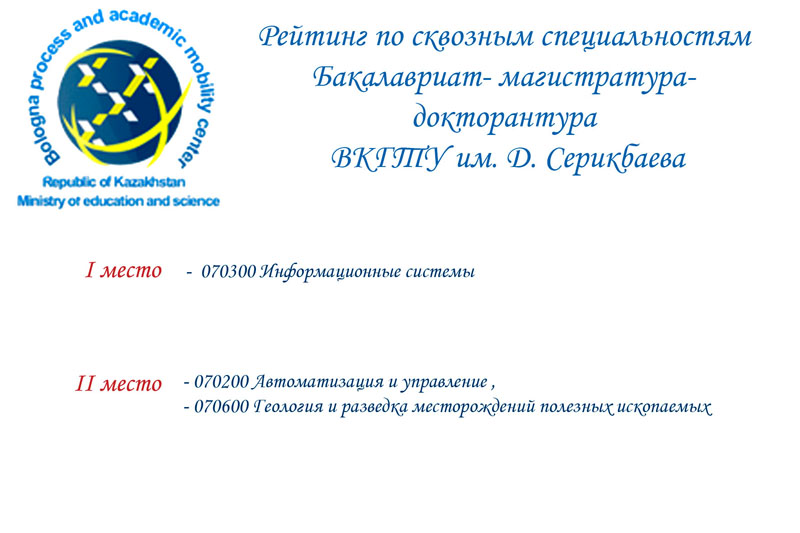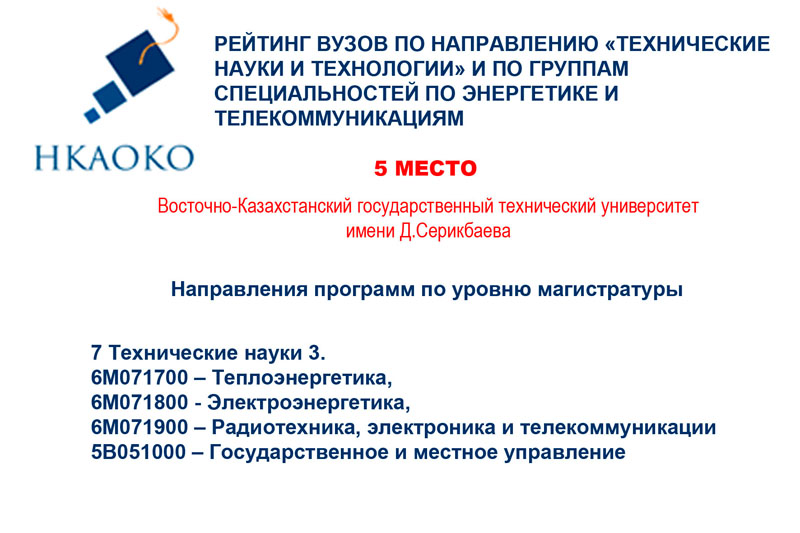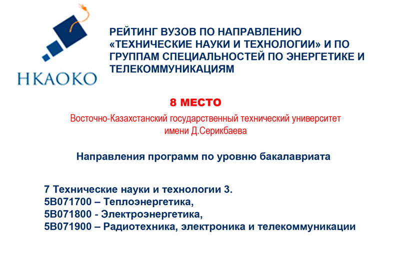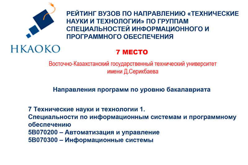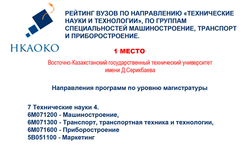 Д. Серикбаев атындағы ШҚМТУ БСҚТҚА 2014 ж. Рейтингісі техникалық ЖОО арасындағы Басты рейтингте 7 орын алды.