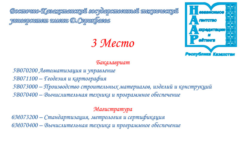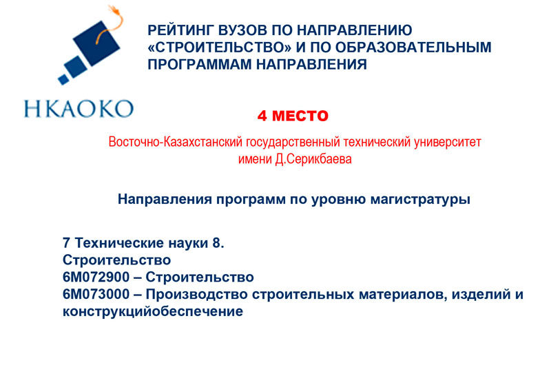 ТАРА өткізетін рейтингке орай Д. Серикбаев атындағы ШҚМТУ Қазақстанның ең үздік 20 жоғары оқу орындары арасында 4 орынға ие болды.