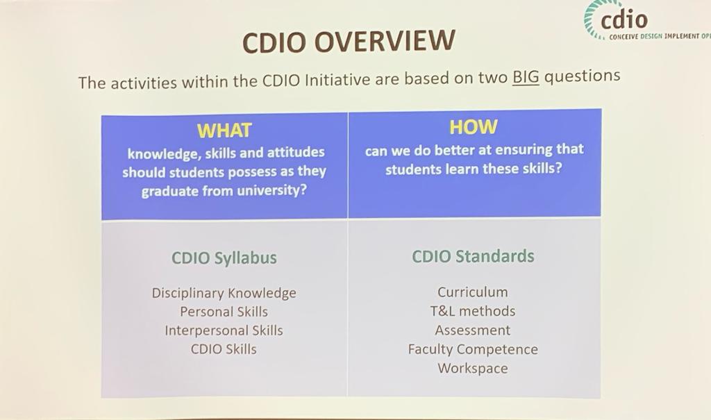 CDIO ірі халықаралық жобасының мүшелері жобаға қатысушы жоғары оқу орындарында бакалавриат деңгейінде инженерлік білім беруді жетілдірудің прогрессивті және заманауи тұжырымдамасын әзірлейді және енгізеді. Бұл инженерлік білім берудегі теория мен практика арасындағы қайшылықтарды жоюға бағытталған халықаралық жоба. Жаңа тәсіл оқытудың практикалық бағытын күшейтуді, сондай-ақ проблемалық және жобалық оқыту жүйесін енгізуді көздейді.