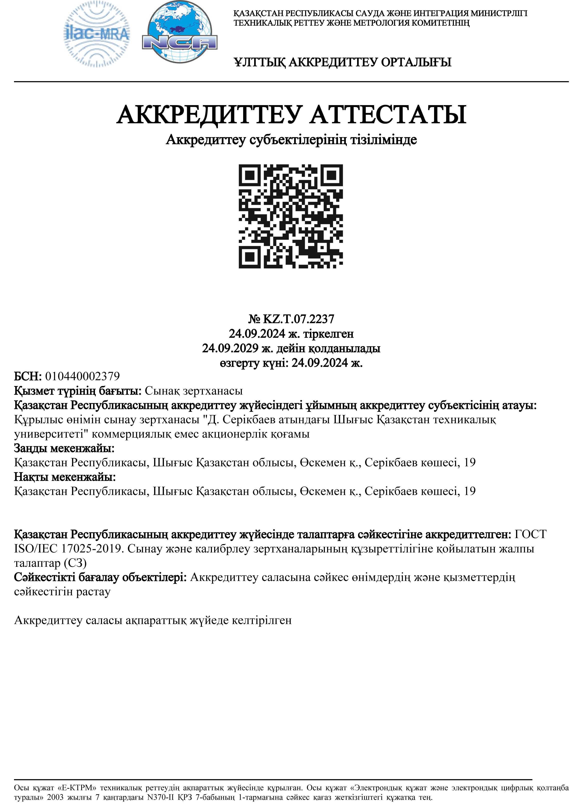 - МЕМСТ талаптарына сәйкес аккредиттелген зертханада құжаттаманы жүргізу ISO/IEC 17025.