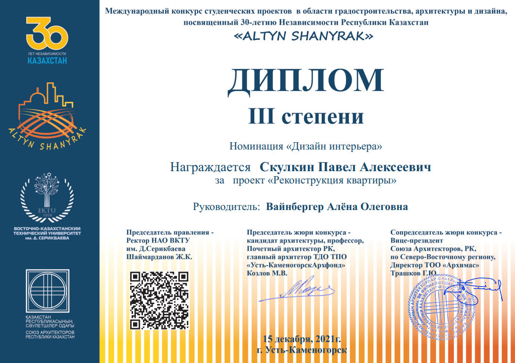 Студенттердің сапалы дайындық деңгейі олардың әртүрлі халықаралық байқаулардағы, түрлі шығармашылық байқаулар мен көрмелердегі нәтижелерімен расталады. 2021 жылы Д. Серікбаев атындағы Шығыс Қазақстан техникалық университетінің "Сәулет" және "Сәулет ортасының дизайны" ББ оқытушылары ұжымының ұйымдастыруымен "ALTYN SHANYRAK" халықаралық байқауы өтті. Қазақстан Республикасы Сәулетшілер одағының қолдауымен 18-ДА-1 тобының 4 курс студенті "Интерьер дизайны"номинациясы бойынша III дәрежелі Диплом алды.