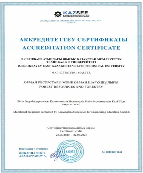 7M08301 – Образовательная программа "Лесные ресурсы и лесоводство" включает подготовку высококвалифицированных специалистов в области многоцелевого устойчивого и неисчерпаемого использования лесов Республики Казахстан, разработки и реализации мероприятий по инвентаризации лесов, применению информационных технологий и аэрокосмических методов в лесном хозяйстве и ландшафтном строительстве, подготовку высококвалифицированных, конкурентоспособных на рынке труда для лесохозяйственных научно-исследовательских предприятий учетно-проектные, производственно-технологические работы на лесохозяйственных предприятиях региона и востребованные, предназначен для подготовки специалистов, способных выполнять организационные работы.