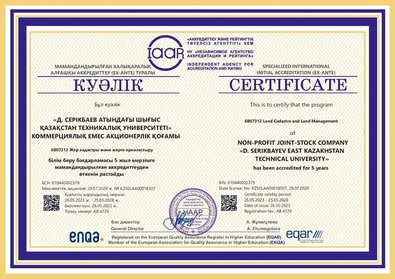 В апреле 2023 года образовательная программа 6В07312 – Земельный кадастр и землеустройство успешно прошла международную специализированную аккредитацию.