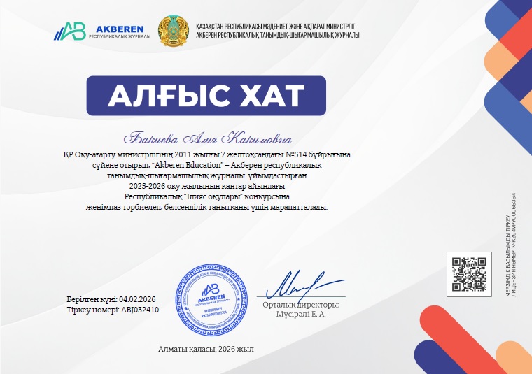 Клуб жетекшісі Әлия Кәкімқызы Бакиева конкурсқа жеңімпаз тәрбиелеп, белсенділік танытқаны үшін Алғыс хатпен марапатталды.