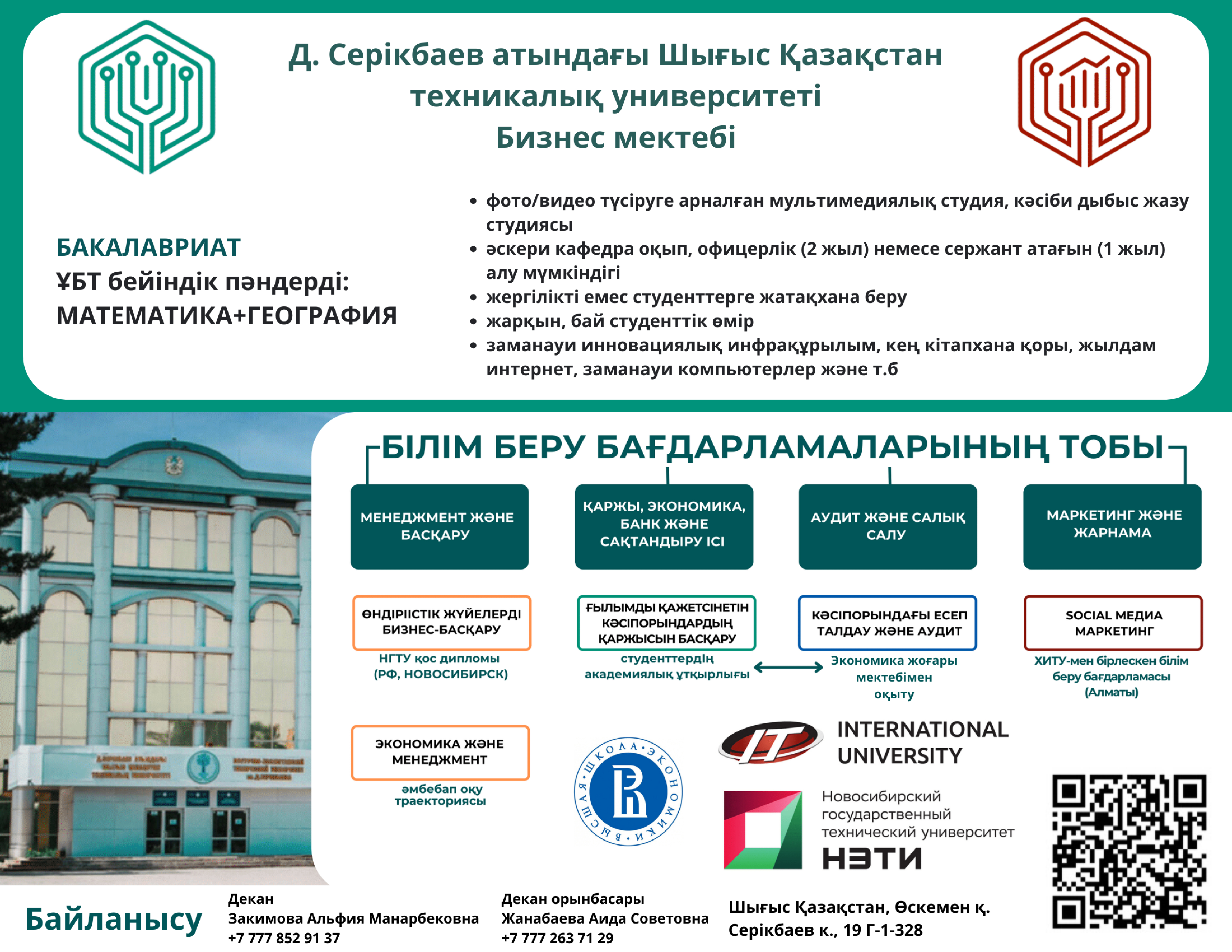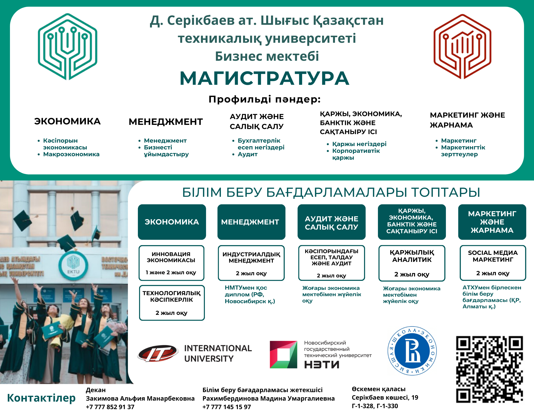 Dynamically changing conditions of the external and internal environment of modern enterprises dictate the need for all specialties of D. Serikbayev EKTU, including technical ones, to study the basics of market economy, entrepreneurship, management, marketing as an educational reserve for effective timely response to changes in future professional activity.
