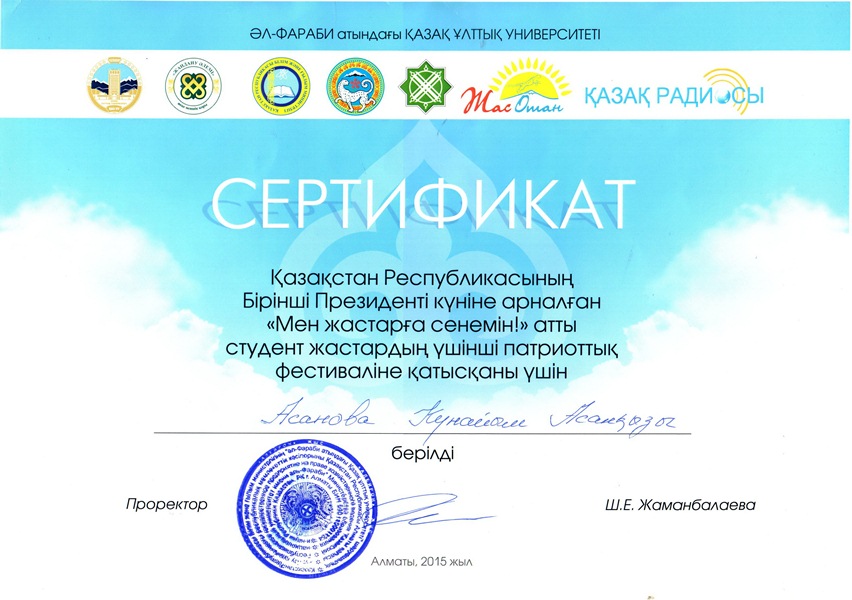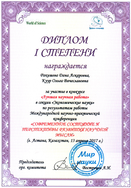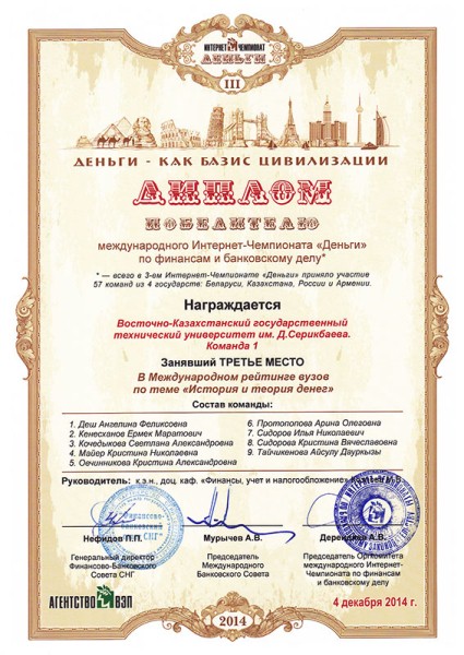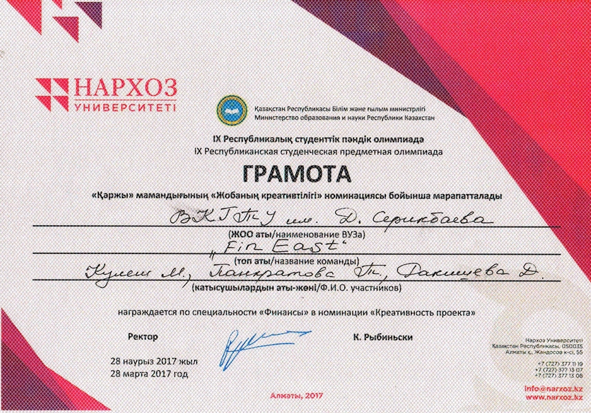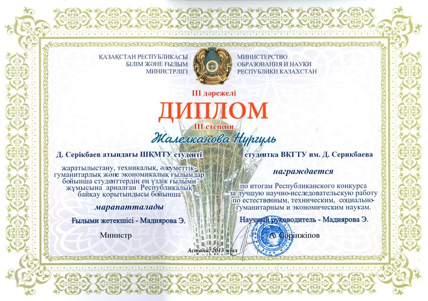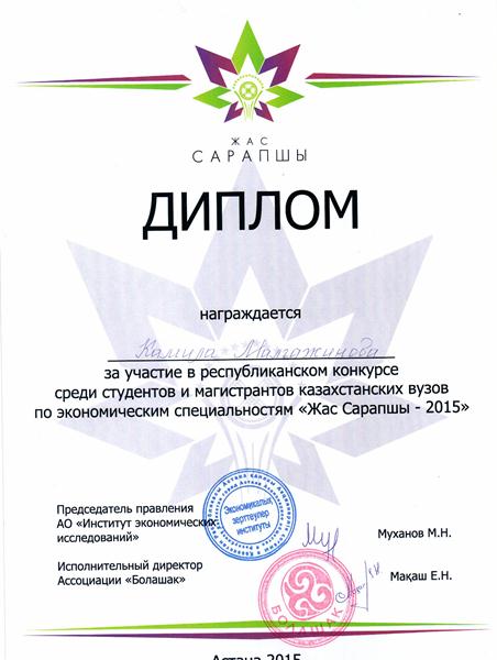 В 2014 году магистрант специальности «Учет и аудит» Бирликпаева Д.К. выиграла конкурс НИР студентов высших учебных заведений РК и получила диплом II степени.