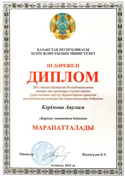 В 2011 г. студент специальности «Финансы» Каримова А. выиграла конкурс научно-исследовательских работ студентов высших учебных заведений РК и получила диплом III степени.
