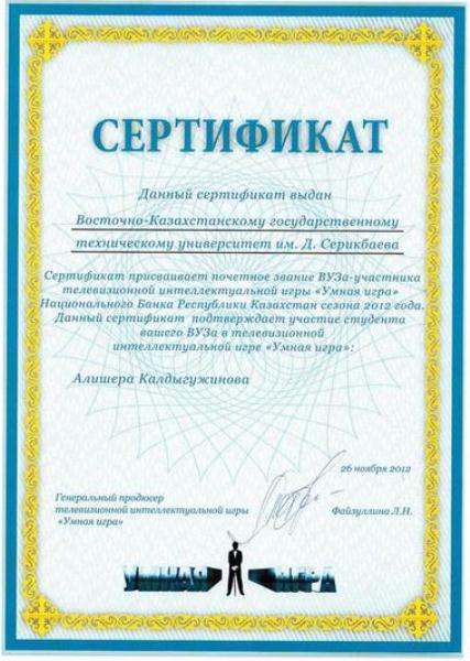 В 2012 г. студент специальности «Финансы» Калдыгужинов А.А. стал участником полуфинала телевизионной интеллектуальной игры «Умная игра» Национального Банка Республики Казахстан.