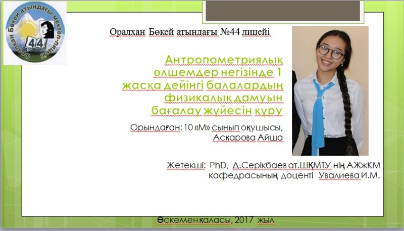 - Асқарова Айша Асқарқызы «Антропометриялық өлшемдер негізінде 1 жасқа дейінгі балалардың физикалық дамуын бағалау жүйесін құру»;