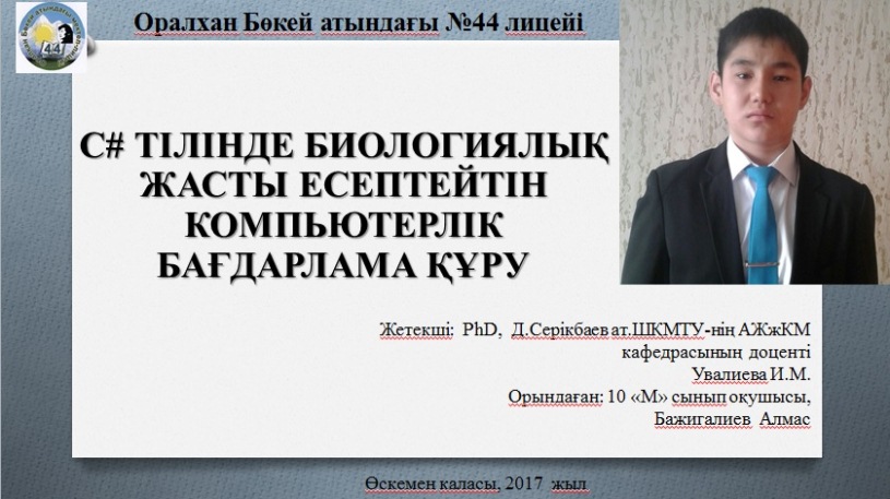- Бажиғалиев Алмас Нұрланұлы «C# тілінде адамның биологиялық жасын есептейтін компьютерлік бағдарламаны құру»;