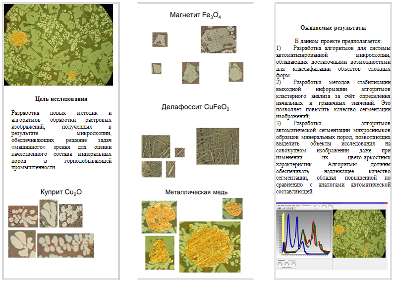- Development of methods and algorithms for image recognition for the evaluation of the qualitative composition of mineral rocks in the mining industry. The customer: the Ministry of Education and Science of the Republic of Kazakhstan. The head: Baklanova O.E.;