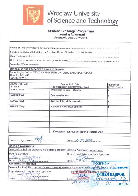 «5В070500 Математикалық және компьютерлік үлгілеу» мамандығының студенттері Вроцлав университетімен екі жақты келісімшарт бойынша жыл сайын академиялық жұмылғыштық бағдарламасы бойынша білім алады: