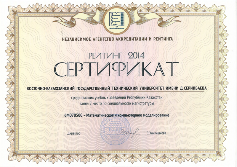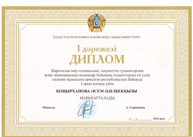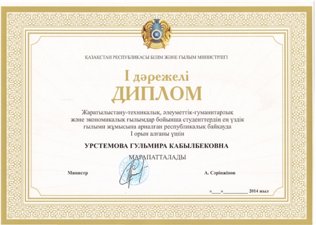 - 2014 жыл – ҚР АРТА бағасы, 2 орын;