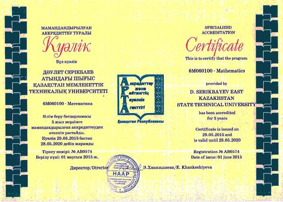 6M060100 – Математика мамандығының білім беру бағдарламасы 2015 жылы №АВ0574 01.06.2015 бастап НААР мамандандырылған аккредитациядан өтті. Магистратурада мамандарды дайындау «Алгебра және математикалық логика» және «Есептеу математикасы» білім беру бағдарламалары бойынша жүргізіледі. Магистранттар оқу үрдісі кезінде іргелі және терең білім қорын алады. Бағдарламаның негізгі пайдаланушылары мен мүдделі жақтары: