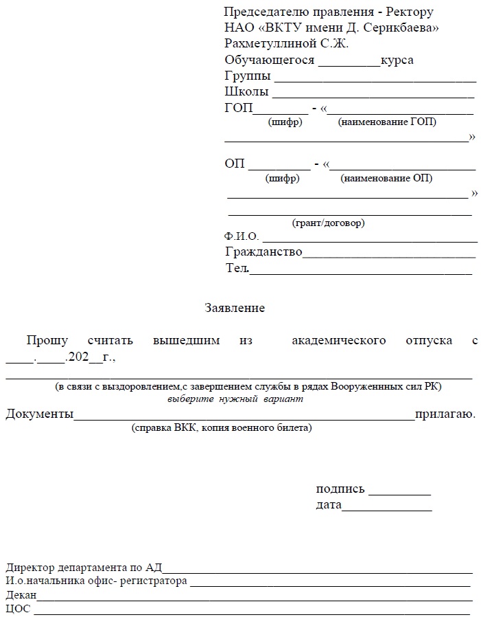 Прошу считать вышедшим из академического отпуска в связи с _______________________________________________________________________________ дата выхода из академического отпуска в связи ______________________________________________________________________ с демобилизацией из рядов ВС РК, с выздоровлением ______________________________________________________________________ прилагаю копию военного билета, справку ВКК