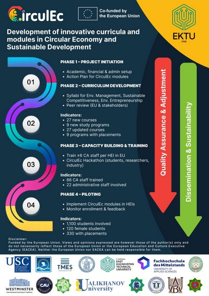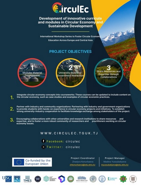 Еуропалық Одақ қаржыландыратын CirculEC жобасы климаттық бейтарап және ресурсты тиімді қолданатын экономикаға көшу үдерісін жеделдетуге бағытталған. Бұл мақсат университеттерді инновациялық оқу модульдерімен қамтамасыз ету және институционалдық әлеуетті нығайту арқылы жүзеге асырылады. Жобаны ШҚТУ үйлестіреді, ал консорциумға Қазақстан, Өзбекстан, Тәжікстан, Түрікменстан, Германия, Испания және Италия университеттері кіреді.