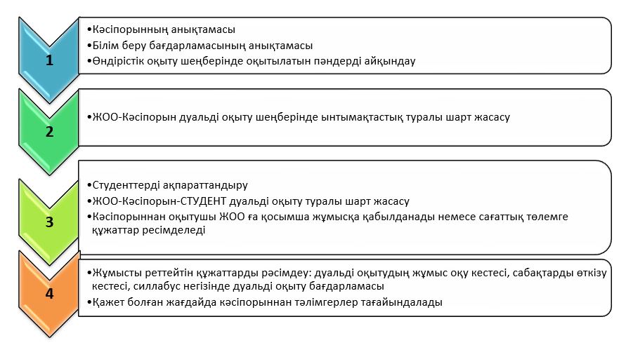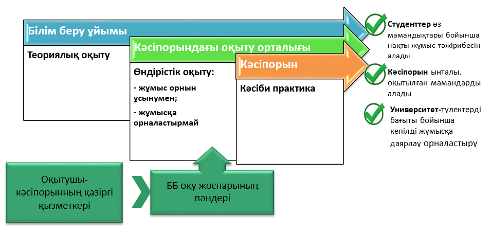 Бұл тәсіл түлектерге тек білім алуға ғана емес, сонымен қатар еңбек нарығында сұранысқа ие нақты құзыреттіліктерге ие болуға, ал кәсіпорындарға болашақ мамандарды нақты өндірістік міндеттерге дайындауға мүмкіндік береді.