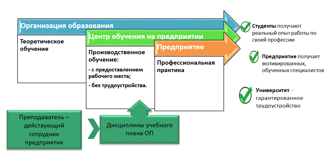 Цель дуального обучения – создание системы взаимодействия университета и производства для практико-ориентированной подготовки конкурентоспособных кадров, востребованных на рынке труда, обладающих широким спектром профессиональных компетенций.