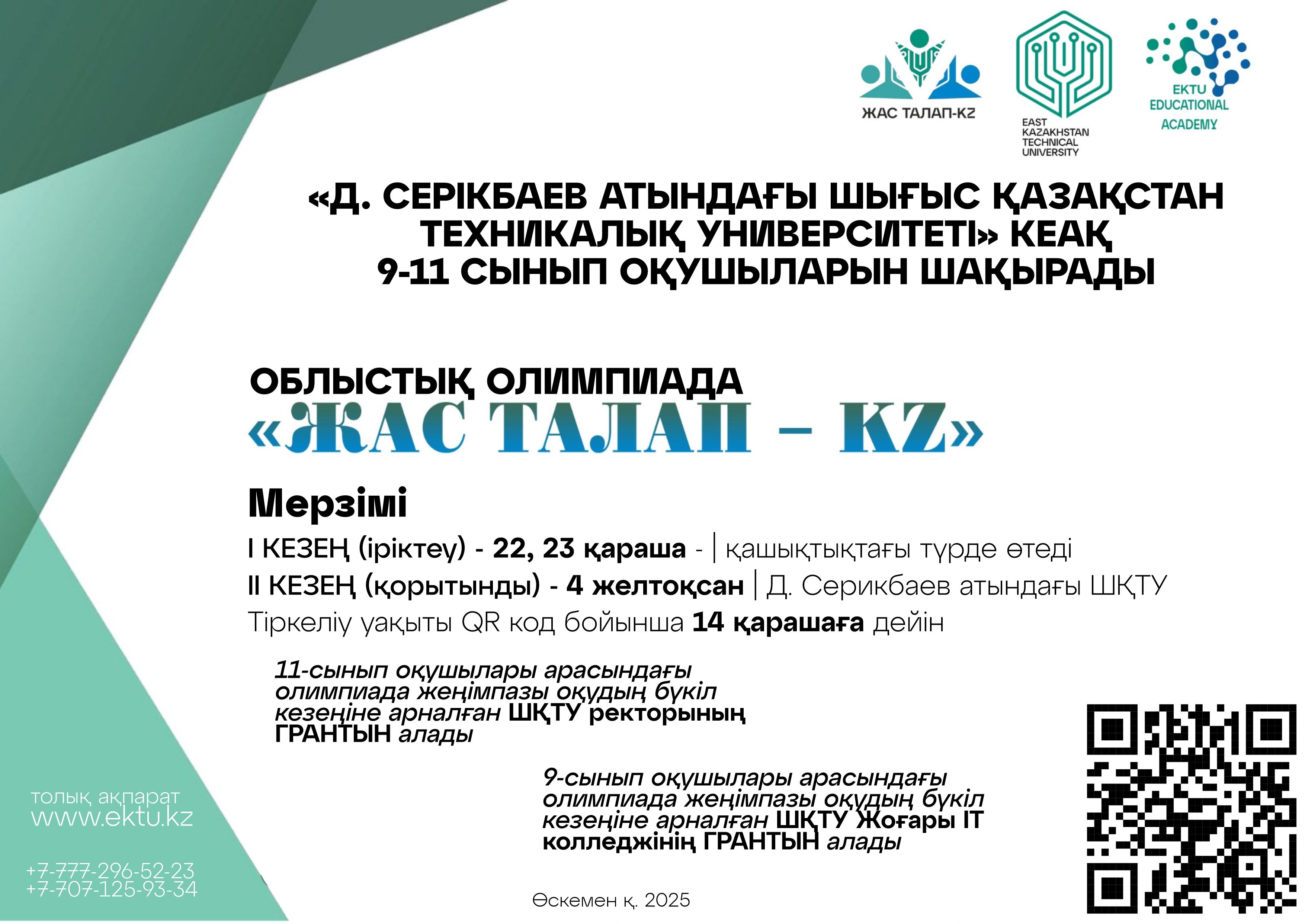 Д.Серікбаев атындағы ШҚТУ Қазақстан Республикасының жалпы білім беру мекемелерінің 9, 10 және 11 сынып оқушылары арасында «Жас Талап-KZ» облыстық олимпиадасын өткізеді.