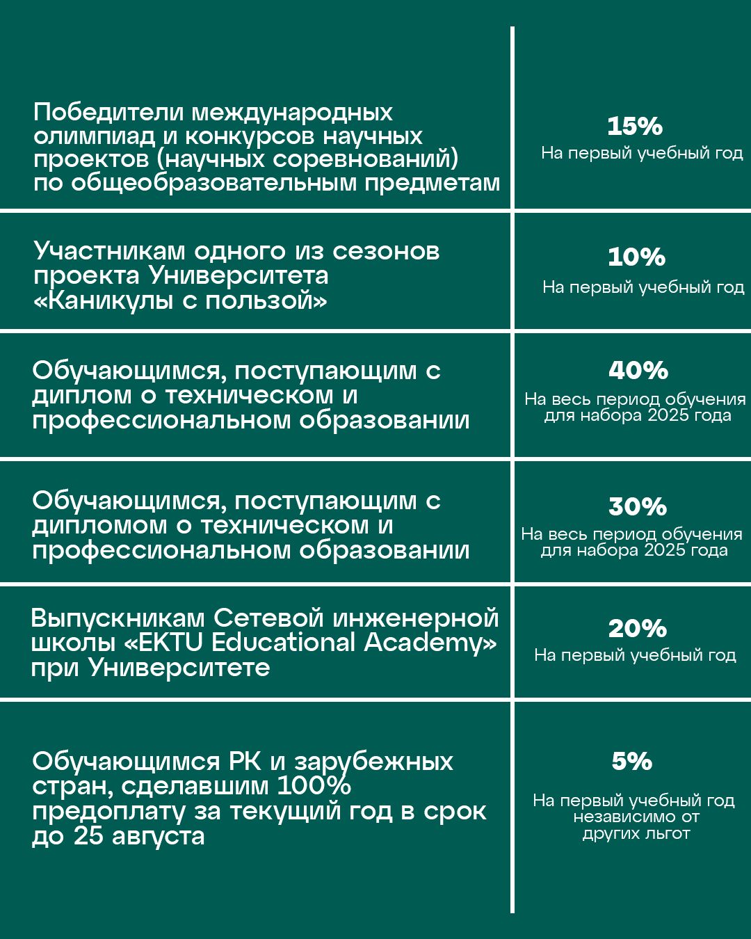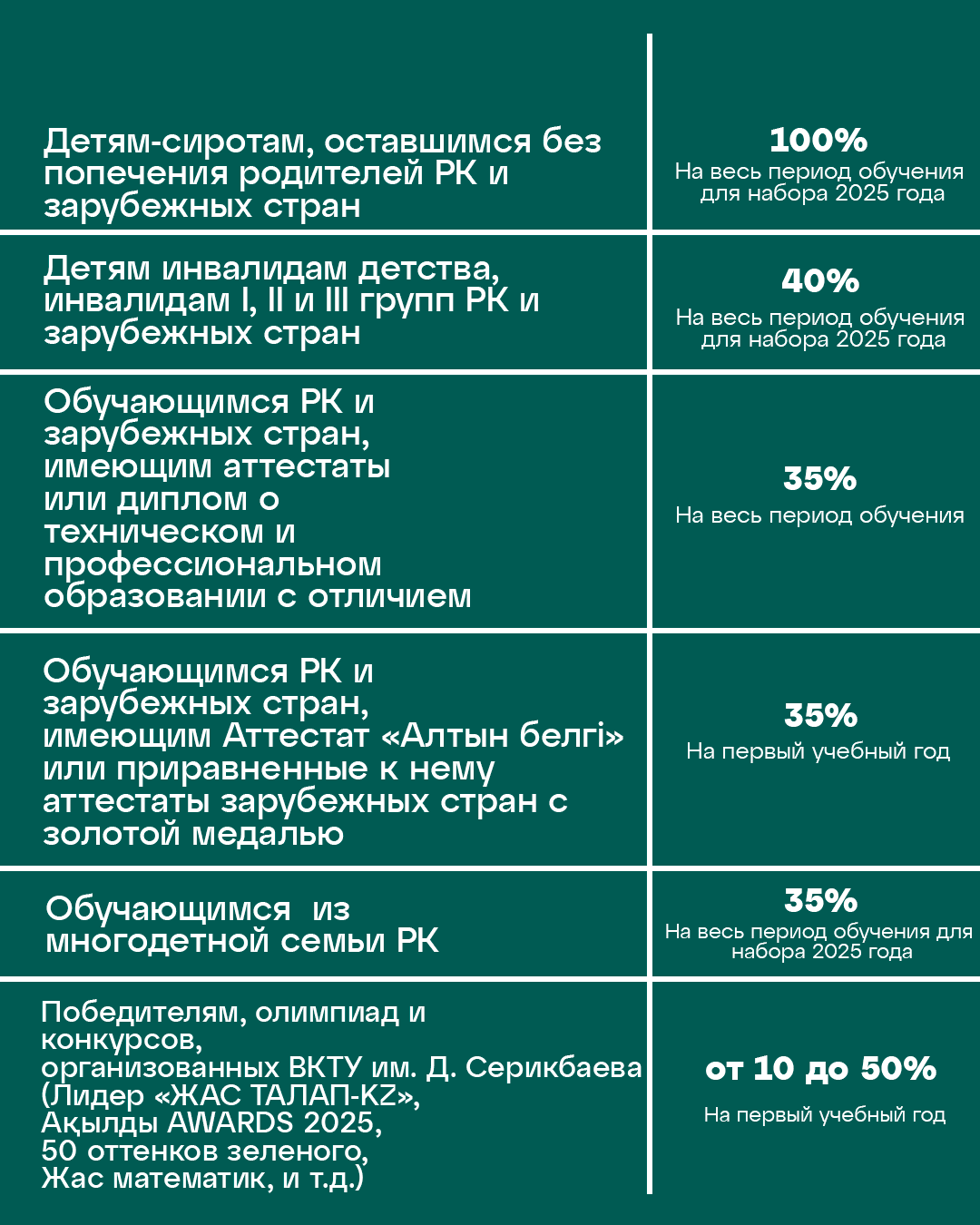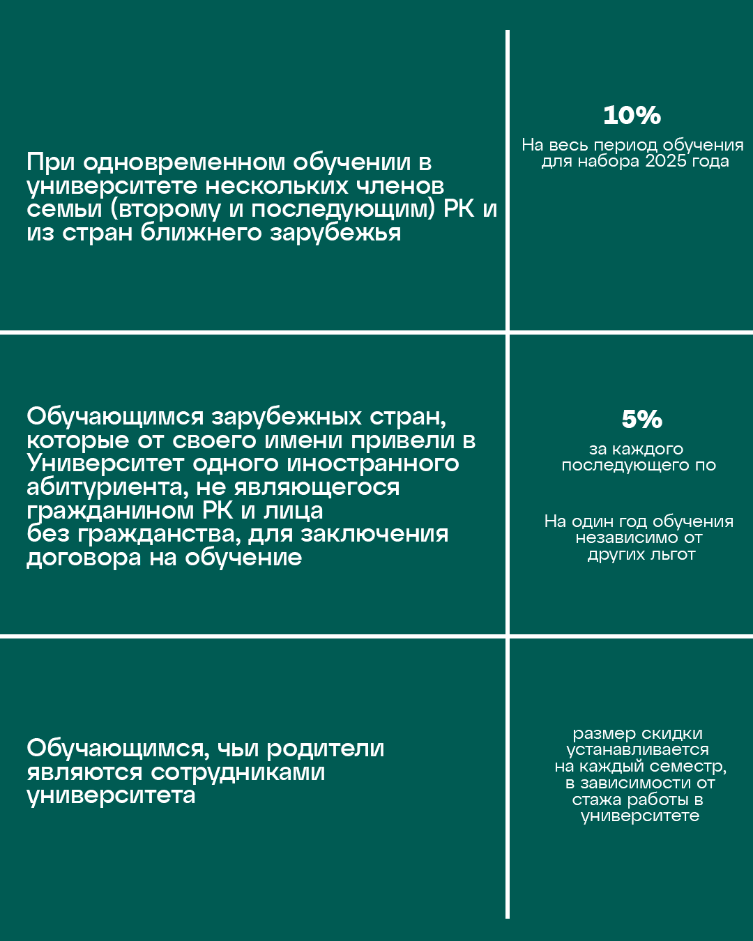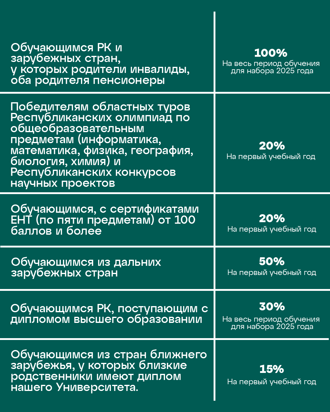 Бакалавриат бойынша 5 %-дан 100 %-ға дейінгі жеңілдіктер бар — пәндік олимпиадалар мен байқаулардың жеңімпаздарына, ҰБТ-дан жоғары балл (100 және одан жоғары) жинағандарға, отбасындағы алғашқы жоғары білім алушыға және басқа да санаттарға беріледі. I–III топтағы мүгедектер мен жетім балалар үшін оқу ақысы толық тегін.