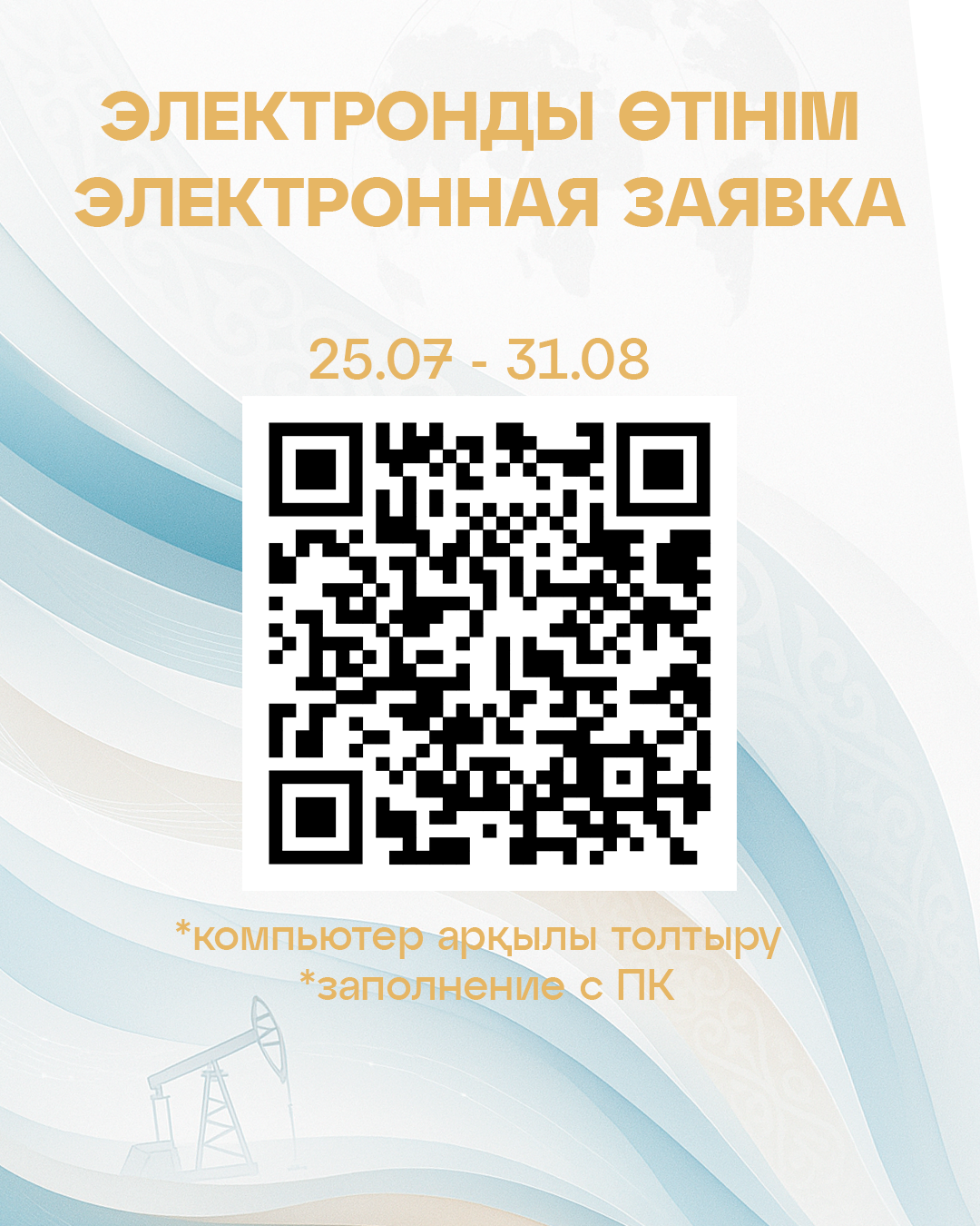 Құжаттарды қабылдау және тіркеу 2025 жылғы 25 шілдеден бастап 31 тамызға дейін жүзеге асырылады. Электрондық өтінімді келесі сайтта көрсетілген мерзімде толтыру қажет: https://grant.kazenergy.com/