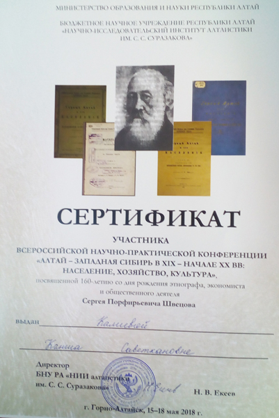В г. Горно-Алтайск состоялась всероссийская научно-практическая конференция «Алтай-Западная Сибирь в XIX – начале XX вв: население, хозяйство, культура», посвященная 160-летию со дня рождения этнографа, экономиста и общественного деятеля Сергея Швецова. Доцент кафедры «История Казахстана и социально-политические дисциплины» ВКГТУ им. Д. Серикбаева Канша Калиева приняла участие в мероприятии и получила сертификат данной конференции.