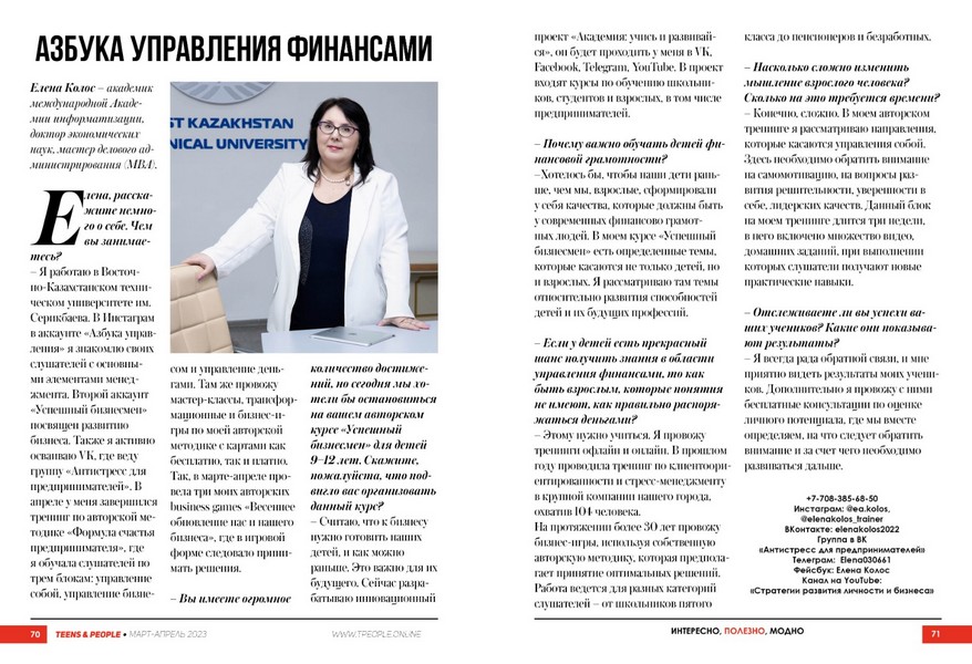 Также является бизнес-тренером по менеджменту, более 30 лет работает с различными категориями населения. В социальной сети YouTube есть канал «Стратегии развития личности и бизнеса». Обладает апробированной уникальной методикой выбора и принятия решения. Проводит бесплатные консультации, по оценке личного потенциала. В настоящее время активно развивается в онлайн сфере. По версии музыкального канала Muzzone стала победителем ежегодной премии TOP Professional в номинации "Бизнес-тренер 2023".
