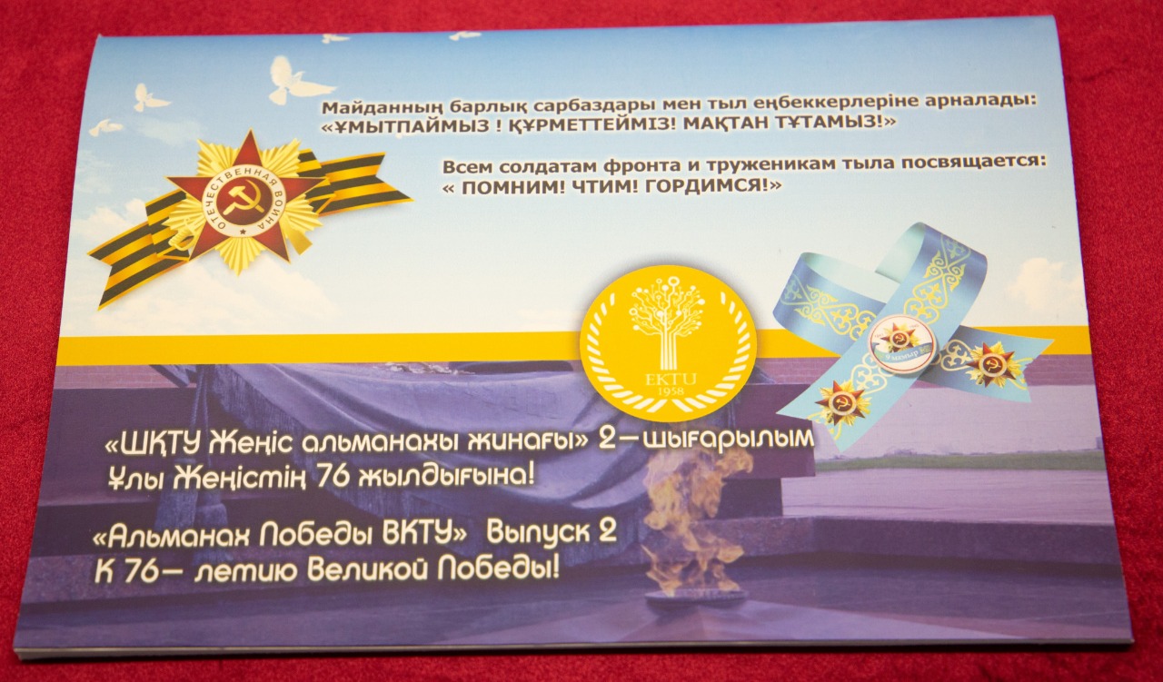 Кроме этого, в этом году выпущен второй номер «Альманаха Победы ВКТУ». В сборнике представлены рассказы, воспоминания о героях великой отечественной: родных и близких, земляках наших сотрудников и студентов. Активное участие в составлении сборника приняла Военная кафедра.