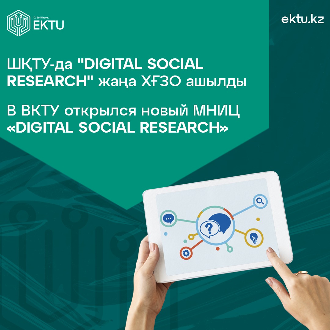 В рамках дальнейшего развития и модернизации научно-исследовательской среды университета в ВКТУ им. Д.Серикбаева приступает к работе новый Международный научно-исследовательский центр «DIGITAL SOCIAL RESEARCH» (МНИЦ «DSR»). Его возглавила Жанна Сакеновна Аубакирова - ассоциированный профессор, кандидат исторических наук, в состав вошли: ведущий научный сотрудник Александр Николаевич Алексеенко, доктор исторических наук, главные научные сотрудники Элеонора Олеговна Столярова, кандидат социологических наук и Нелли Леонидовна Краснобаева, кандидат исторических наук. Социальный капитал международного научного центра также составляет пул зарубежных и казахстанских экспертов - авторитетных исследователей в области Social sciences, с которыми налажены прочные партнерские связи.
