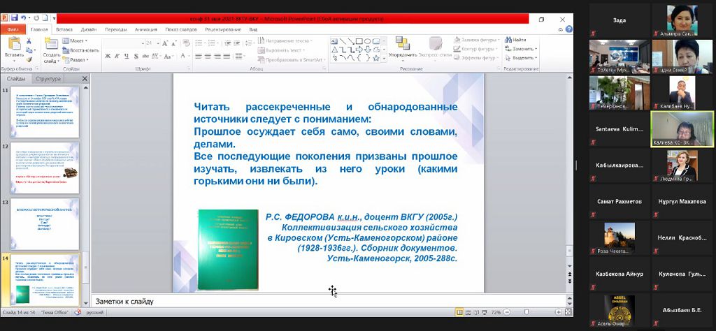 ППС кафедры ИК и СПД активно участвуют в научных меоприятиях, организованных Управлением внутреннней политики ВКО и вузами региона. 28 мая 2021 г. прошел международный вебинар «Память во имя будущего», посвященный Дню памяти жертв политических репрессий. В мероприятии приняли участие представители Института истории РАН (Новосибирск, Россия), Университета Шакарима (Семей), ВКУ им.С.Аманжолова. В докладах участников вебинара были затронуты теоретические и методологические вопросы истории политических репрессий.