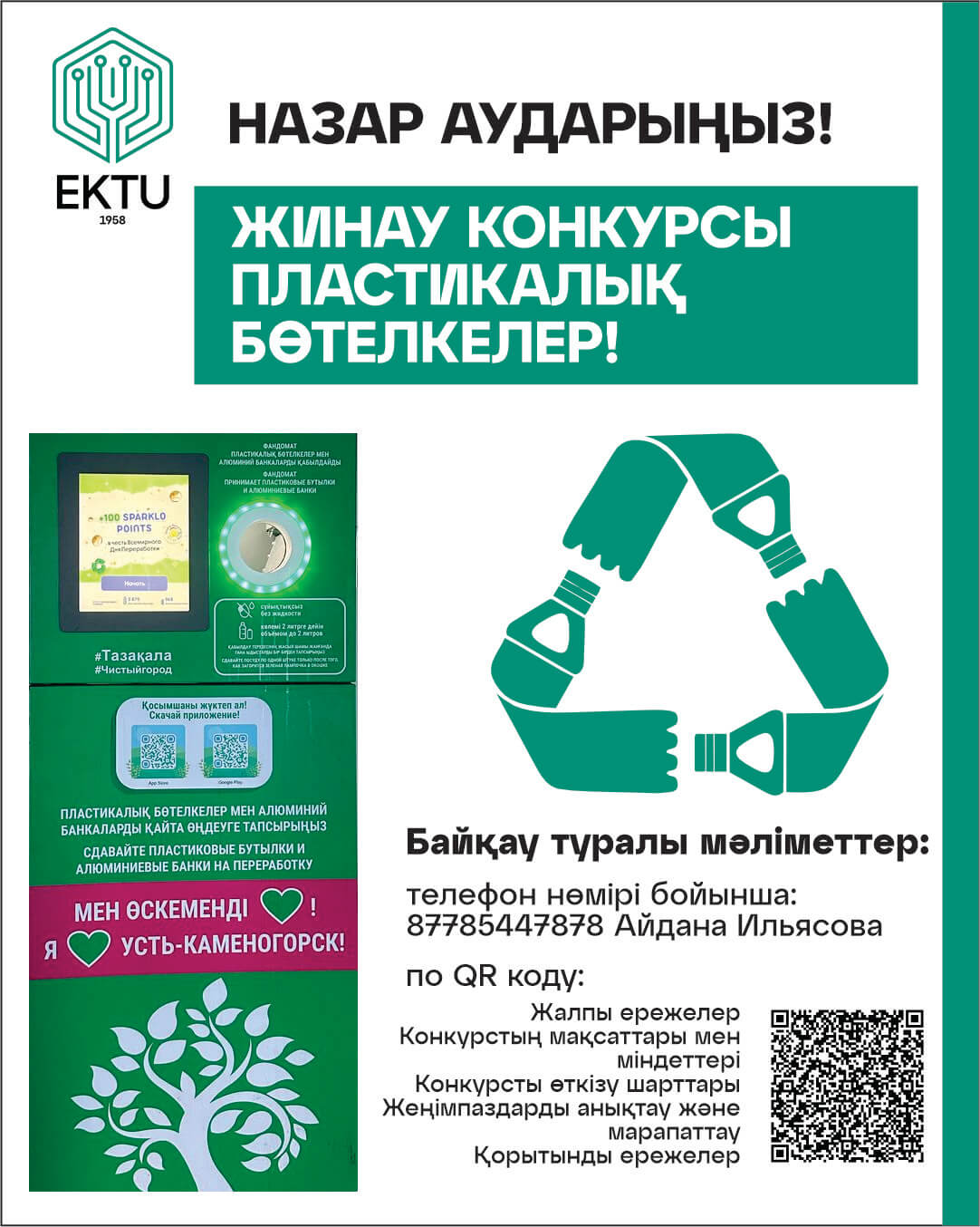 С целью повышения позиций ВКТУ в международных «зеленых» рейтингах (Green Metric, THE Impact и др.), а также в рамках реализации проектов Green Campus и «EKTU.Otbasy - территория благополучия Well-being», ВКТУ объявляет Конкурс по сбору пластиковых бутылок (до 2 литров) через фандомат!