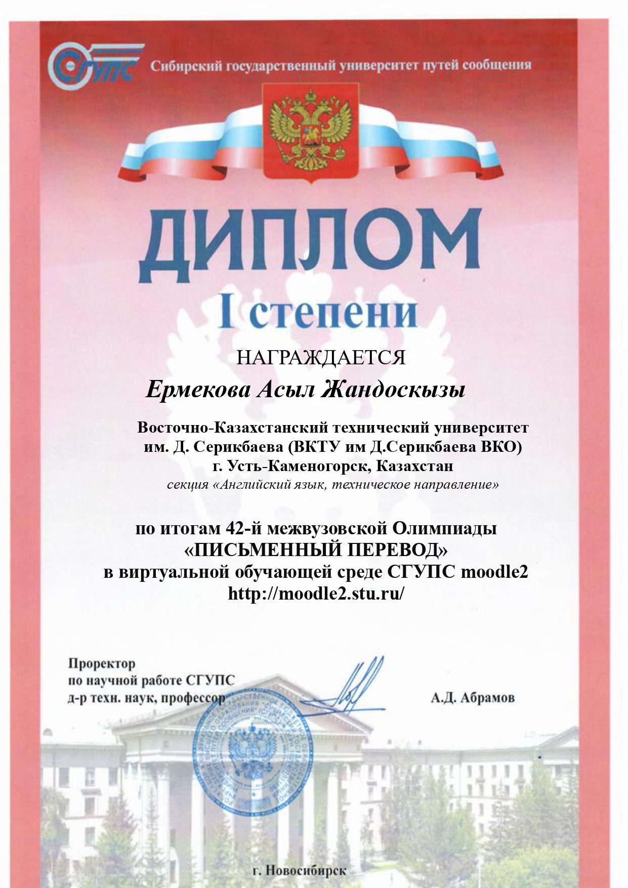 42-ші жоғары оқу орындары арасындағы «Жазбаша аударма» олимпиадасының қорытындысы бойынша Сібір мемлекеттік қатынас жолдары университетінің (Новосибирск қ.) виртуалды оқыту ортасында 6В07301-«Сәулет» білім беру бағдарламасының 1 курс студенті Ермекова Асыл Жандосқызы І орынға ие болды.
