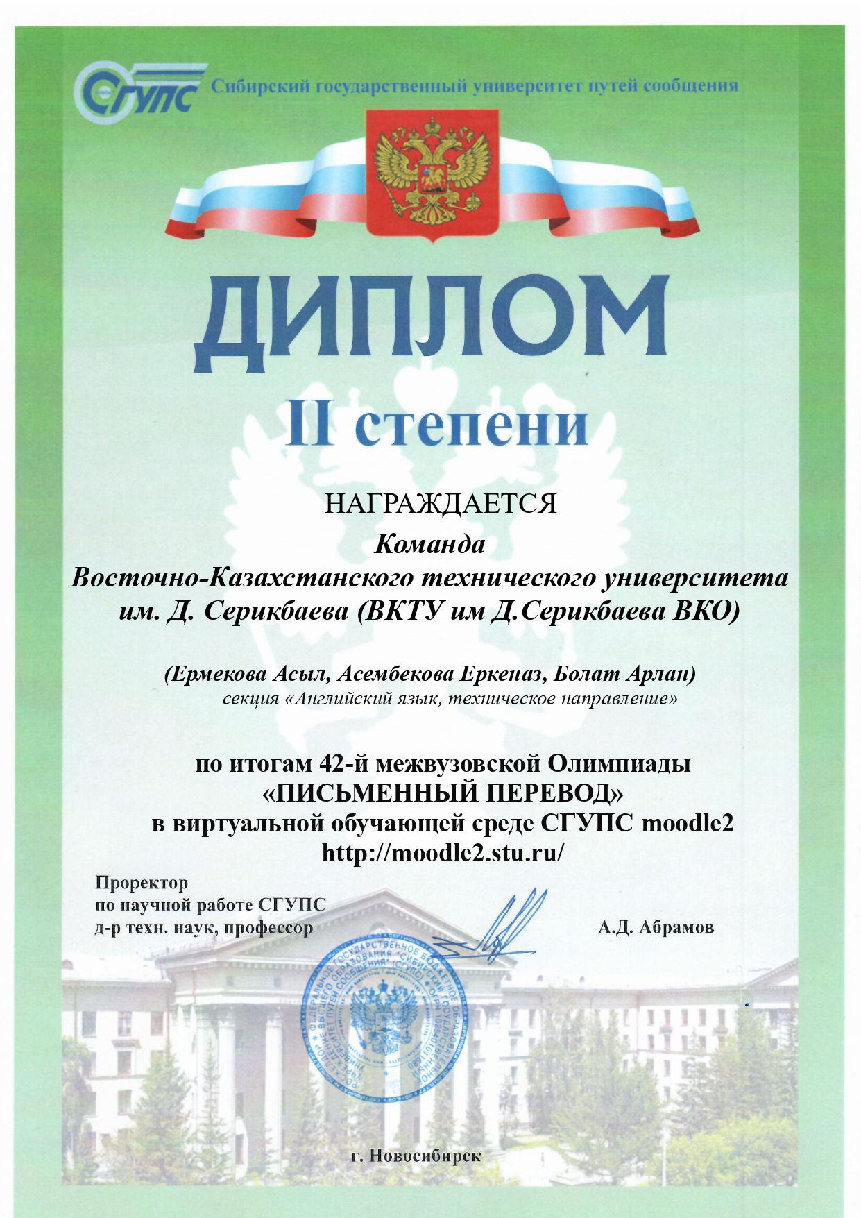 42-ші жоғары оқу орындары арасындағы «Жазбаша аударма» олимпиадасының қорытындысы бойынша Сібір мемлекеттік қатынас жолдары университетінің (Новосибирск қ.) виртуалды оқыту ортасында Д.Серікбаев Шығыс Қазақстан техникалық университетінің командасы 6В07301-«Сәулет» Білім беру бағдарламасының 1 курс студенттерінің құрамында Ермекова Асыл, Әсембекова Еркеназ, Болат Арлан ІІ дәрежелі дипломмен марапатталды.