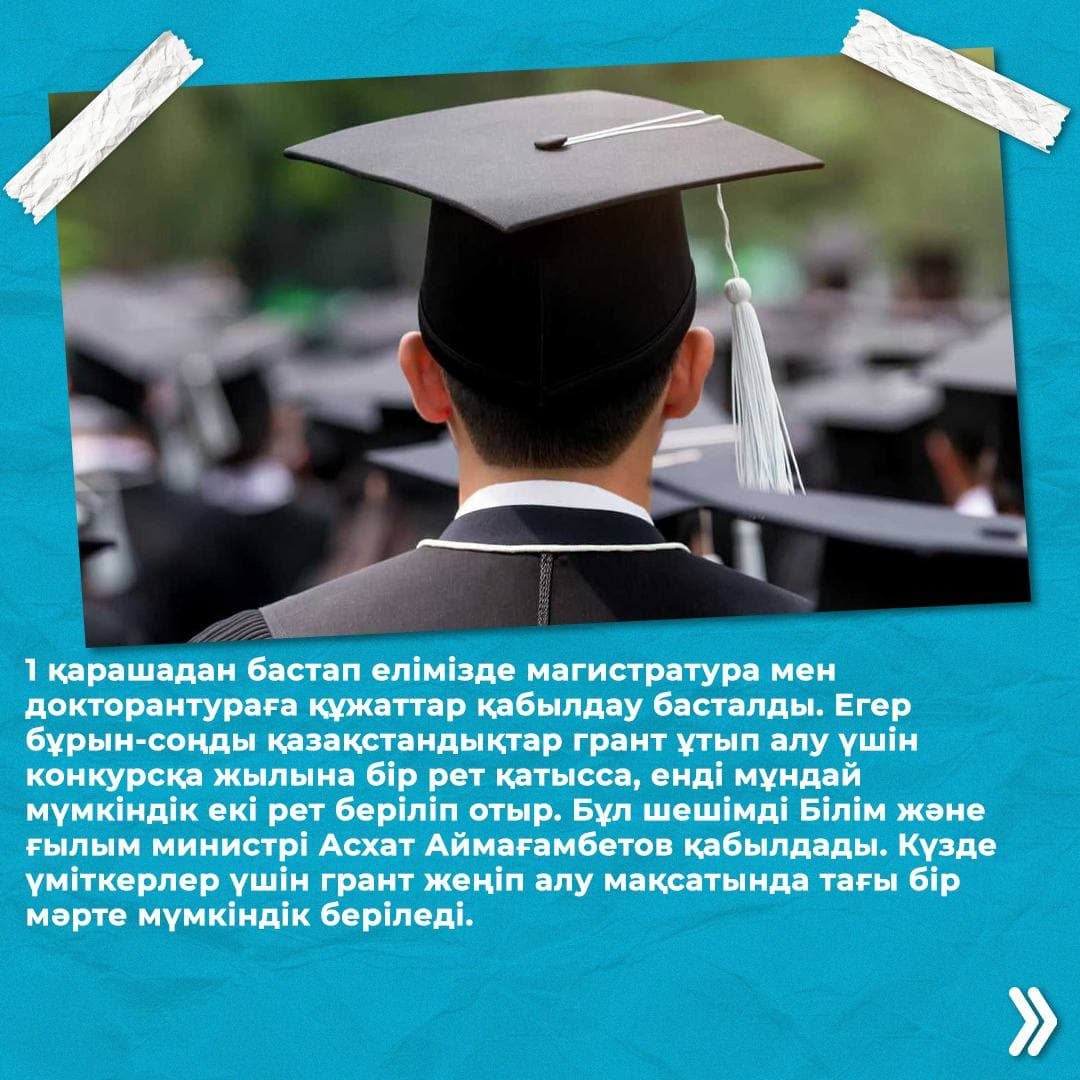 Сонымен, 1 қарашадан бастап елімізде магистратура мен докторантураға құжаттар қабылдау басталды. Егер бұрын-соңды қазақстандықтар грант ұтып алу үшін конкурсқа жылына бір рет қатысса, енді мұндай мүмкіндік екі рет беріліп отыр. Бұл шешімді Білім және ғылым министрі Асхат Аймағамбетов қабылдады. Күзде үміткерлер үшін грант жеңіп алу мақсатында тағы бір мәрте мүмкіндік беріледі.