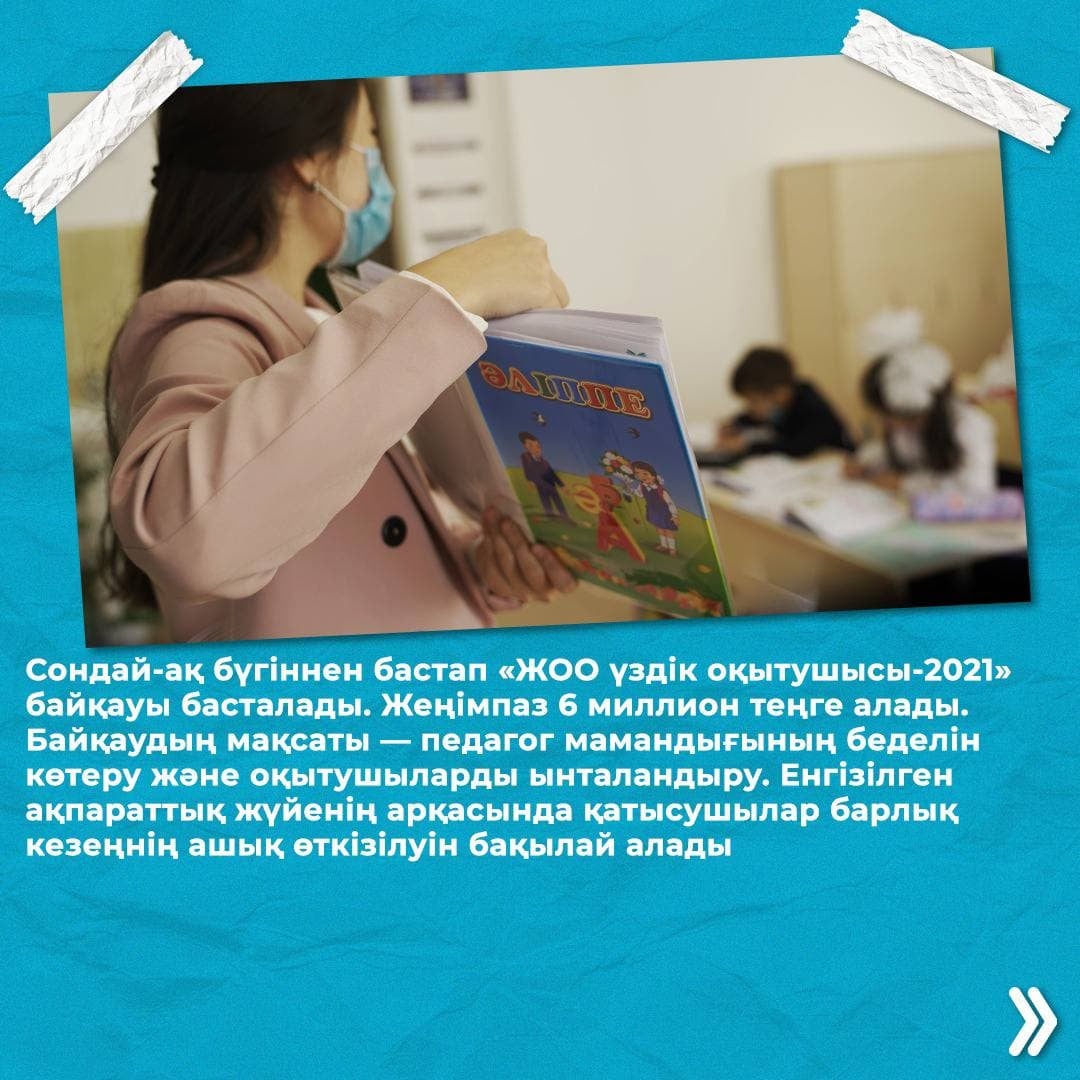 Сондай-ақ бүгіннен бастап «ЖОО үздік оқытушысы-2021» байқауы басталады. Жеңімпаз 6 миллион теңге алады. Байқаудың мақсаты - педагог мамандығының беделін көтеру және оқытушыларды ынталандыру. Енгізілген ақпараттық жүйенің арқасында қатысушылар барлық кезеңнің ашық өткізілуін бақылай алады