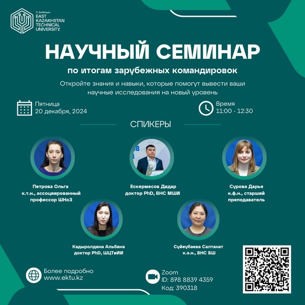 Департамент научно-исследовательской деятельности ВКТУ им. Д. Серикбаева приглашает ученых, исследователей и профессорско-преподавательский состав на семинар, который позволит погрузиться в актуальные темы и ознакомиться с новейшими исследованиями от ведущих экспертов.