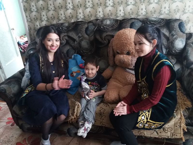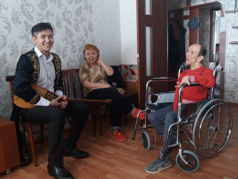 "Нұрлы Жүректер" қайырымдылық еріктілер клубы мен "ВМП"-ның белсенді жастары балаларға кішігірім сыйлықтар табыс етіп, қазақтың ұлттық аспабы домбырамен күй тартып, көңілдерін көтерді.