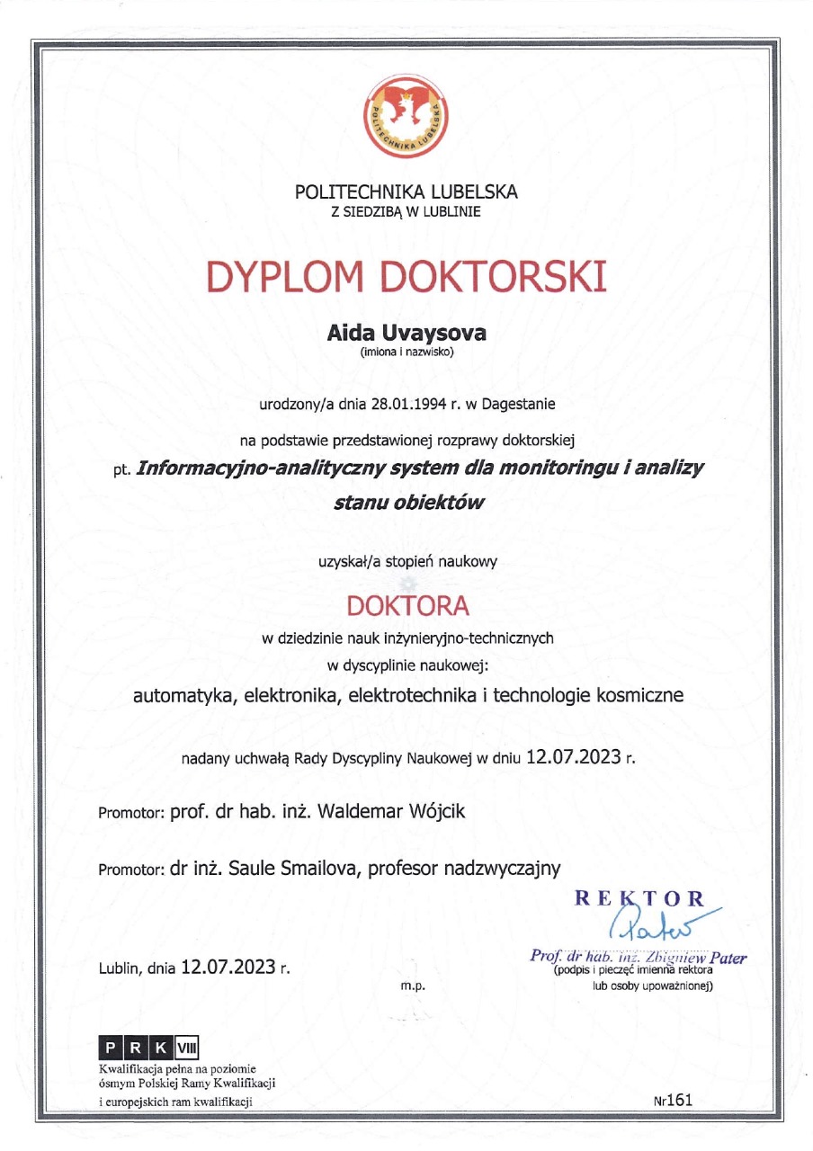 Отметим, что Аиде Увайсовой присвоили степень доктора в области инженерных наук по научным дисциплинам: автоматика, электроника, электротехника и космические технологии.