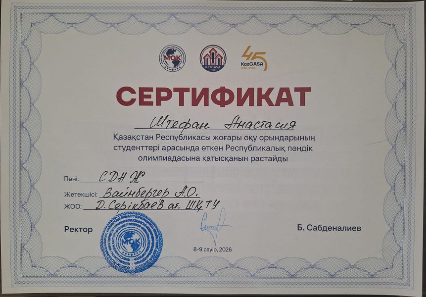 • II дәрежелі диплом — Александров Данил (3-курс, 23-ДА-1). «Сәулеттік дизайн элементтері мен процестері» пәні бойынша жеңіс.